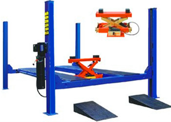 地上式舉升機無需挖槽,適用于任何修理廠,有一些樓板上不適合安裝二柱舉升機以及普通四柱舉升機,而本機器與樓板接觸面廣,這樣可以安裝在任何可以開車的樓板上面,解決客戶場地問題。剪式舉升機比兩柱和四柱舉升機極大的好處是不占用空間,方便使用,不足之處則是補油平衡要求很嚴格,而且需配備控制箱,造價較貴。